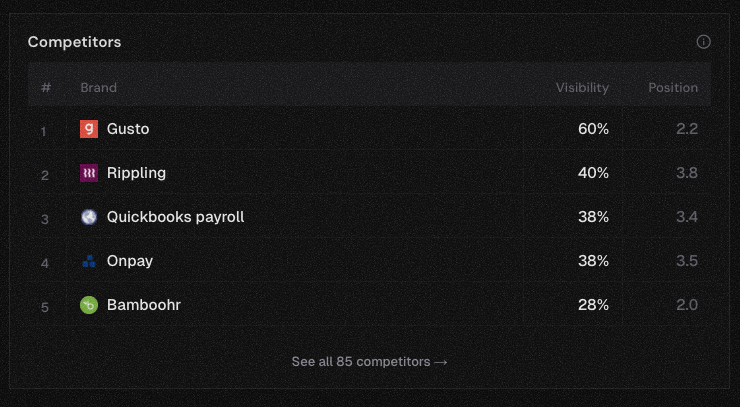 Gusto showed up in 60% of AI responses. Rippling at 40%. QuickBooks Payroll at 38%. OnPay at 38%. BambooHR at 28%.