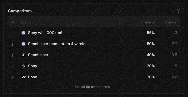 Beats never appeared. Not once across any model or any prompt variation. Sony showed up every time. Sennheiser, Bose, Apple. Beats has more brand recognition than most of them combined and a marketing budget that dwarfs the competition.