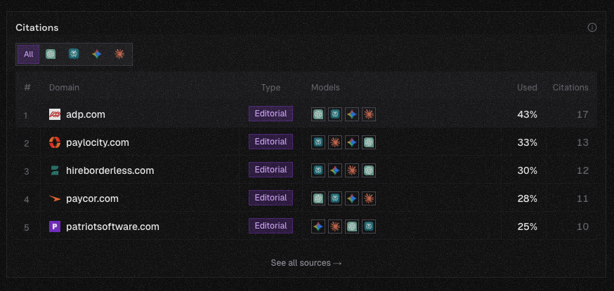Here the cited domains mix vendors (including adp.com), close competitors, and comparison content — so the shortlist in the answer reflects both who gets linked and who the narrative favors.