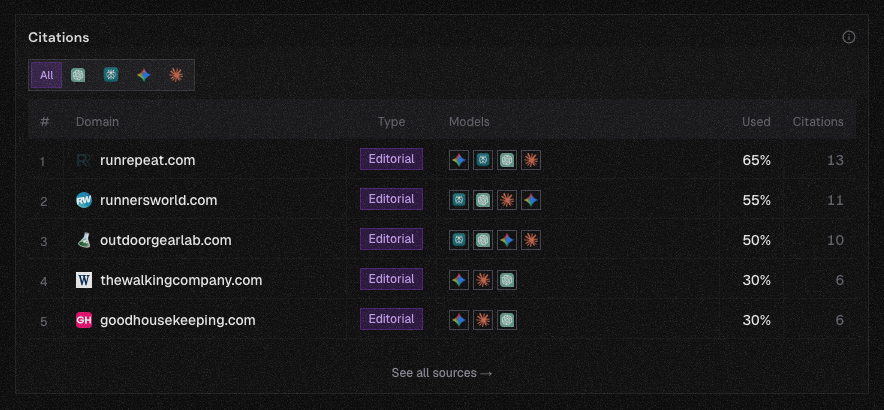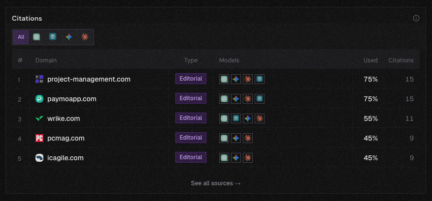 For project management, roundups and category publishers show up repeatedly in Citations — a narrow band of trusted domains that multiple models share.